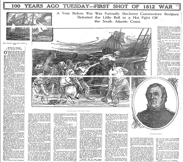 100 YEARS AGO TUESDAY -- FIRST SHOT OF 1812 WAR: A Year Before War Was Formally Declared Commodore Rodgers Defeated the Little Bell in a Hot Fight Off the South Atlantic Coast. (PDF)