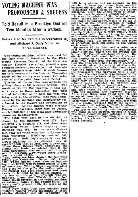 On November 6, 1901, the Times ran another article about voting machines after the first trial in an election. This time the headline read, "VOTING MACHINE WAS PRONOUNCED A SUCCESS; Told Result in a Brooklyn District Two Minutes After 5 o'clock." (PDF)