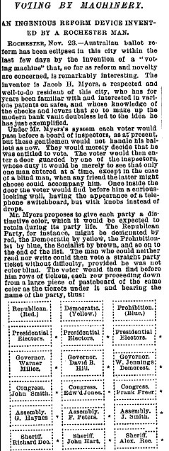 Mr. Myers proposes to give each party a distinctive color, which it would be expected to retain during its party life. The Republican Party, for instance, might be designated by red, the Democratic by yellow, the Prohibitionist by blue, the Socialist by brown, and so on to the end fo the list. The man who could neither read nor write could then vote a straight party ticket without difficulty, provided he was not color blind. The voter would then find before him rows of tickets, each row proceeding down from a large piece of pasteboard of the same color as the tickets under it and bearing the name of the party...