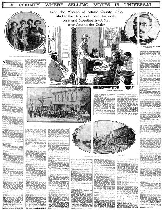 A COUNTY WHERE SELLING VOTES IS UNIVERSAL: Even the Women of Adams County, Ohio, Market the Ballots of Their Husbands, Sons and Sweethearts -- A Minister Among the Guilty. (PDF)