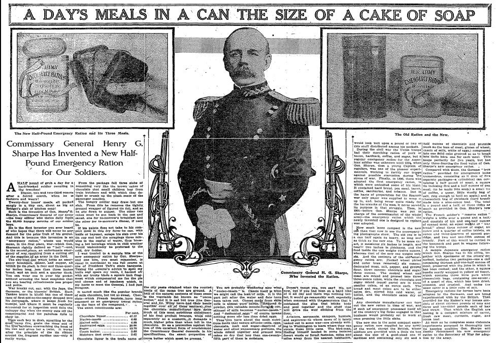 A DAY'S MEAL IN A CAN THE SIZE OF A CAKE OF SOAP: Commissary General Henry G. Sharpe Has Invented a New Half-Pound Emergency Ration for Our Soldiers (PDF)