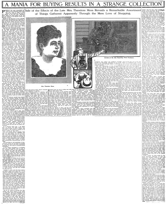 A MANIA FOR BUYING RESULTS IN A STRANGE COLLECTION: Sale of the Effects of the Late Mrs. Theodore Moss Reveals a Remarkable Assortment of Things Gathered Apparently Through the Mere Love of Shopping (PDF)