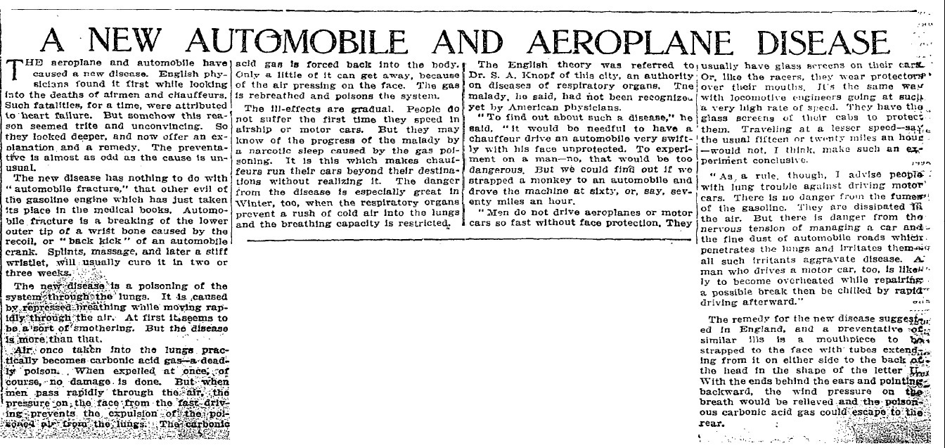 I guess new technologies have always brought scary articles about their dangers. Airplanes and cars were still pretty new, and this article explains that moving so quickly through the air can force so much carbon dioxide into your lungs that you'll die.