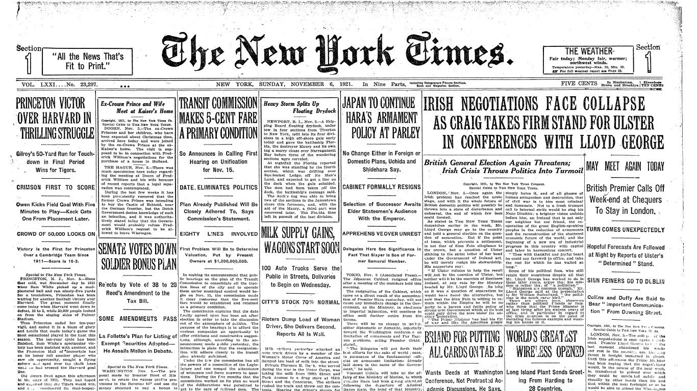 Ostensibly, the focus of this website is to highlight the most interesting articles from the New York Times Magazine 100 years ago to the week. But when going back to the November 6, 1921 issue, something on the front page caught my eye. And since I determined it was more interesting than anything from that issue's actual magazine, I'm going to take a one-installment-only break from tradition to focus on that front page instead.