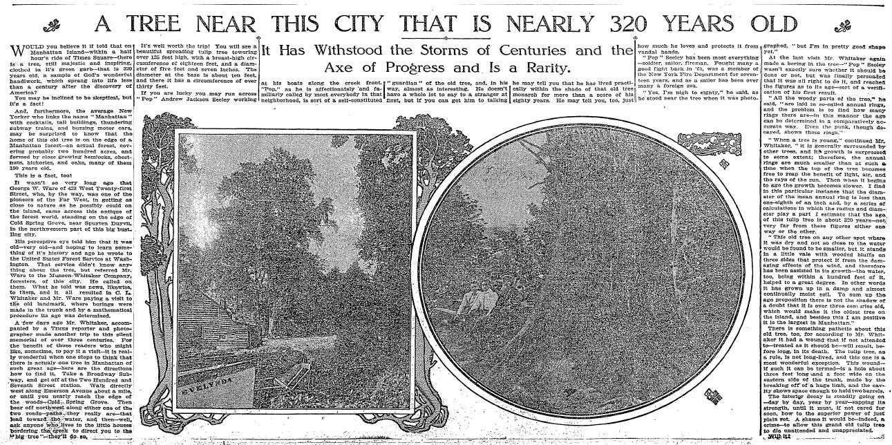 For the benefit of those readers who might like, sometime, to pay it a visit -- it is really wonderful when one stops to think that there is actualy [sic] one tree in Manhattan of such great age -- here are the directions how to find it. Take a Broadway Subway, and get off at the Two Hundred and Seventh Street station. Walk directly west along Emerson Avenue about a mile, or until you nearly reach the edge of the woods -- Cold Spring Grove. Then bear off northwest along either one of the two roads -- paths they really are -- that lead toward the water, and then -- well, ask anyone who lives in the little houses bordering the creek to direct you to the "big tree" -- they'll do so.