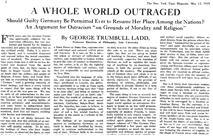 The feelings of an outraged world against an outrageous Germany, as set forth in deeds and fortified by theory, ought to continue undiminished to the end of time. Without faith in the eternal principles of righteousness no one can guarantee that it will be so; but we may be somewhat confident in the belief that these feelings will continue essentially the same for a very considerable time.
