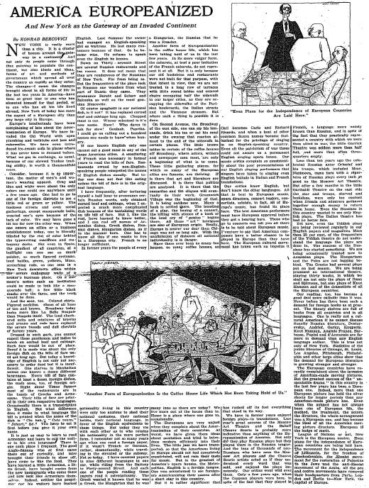 A 1923 New York Times Magazine article by Konrad Bercovici described ways that the U.S. was becoming "Europeanized," including clothing colors, food dishes, and books.