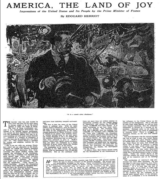 After French Prime Minister Édouard Herriot visited the U.S. in 1924, he wrote a New York Times Magazine essay describing what he called "America, The Land of Joy."
