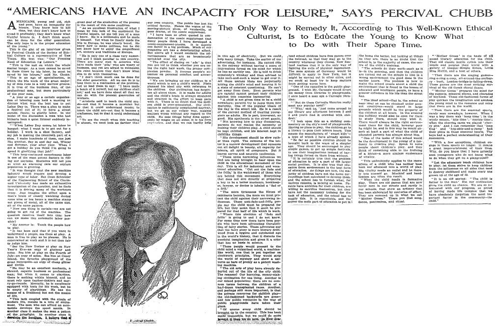 "AMERICANS HAVE AN INCAPACITY FOR LEISURE," SAYS PERCIVAL CHUBB: The Only Way to Remedy It, According to This Well-Known Ethical Culturist, Is to Educate the Young to Know What to Do with Their Spare Time. (PDF)