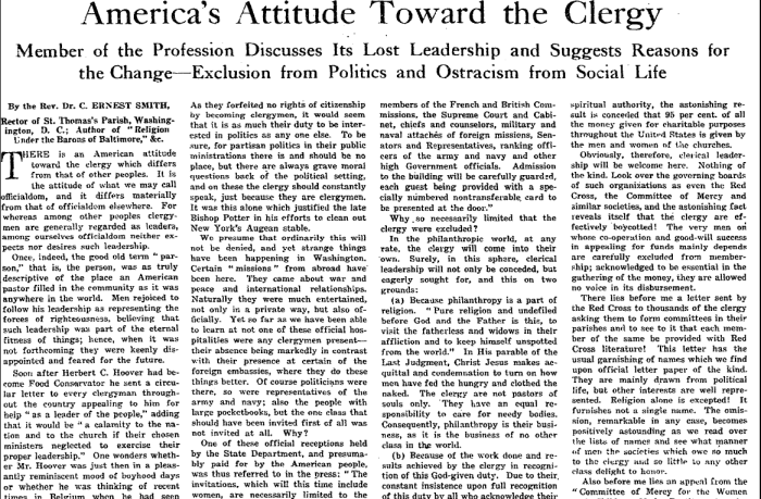 America's Attitude Toward the Clergy: Member of the Profession Discusses Its Lost Leadership and Suggests Reasons for the Change -- Exclusion from Politics and Ostracism from Social Life
