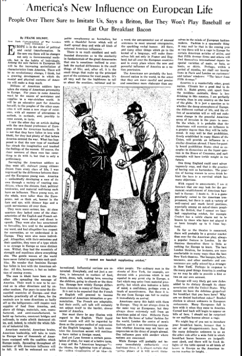 The author Frank Dilnot, New York correspondent for the London Daily Chronicle, did correctly predict one American aspect that would NOT catch on in Europe: baseball.