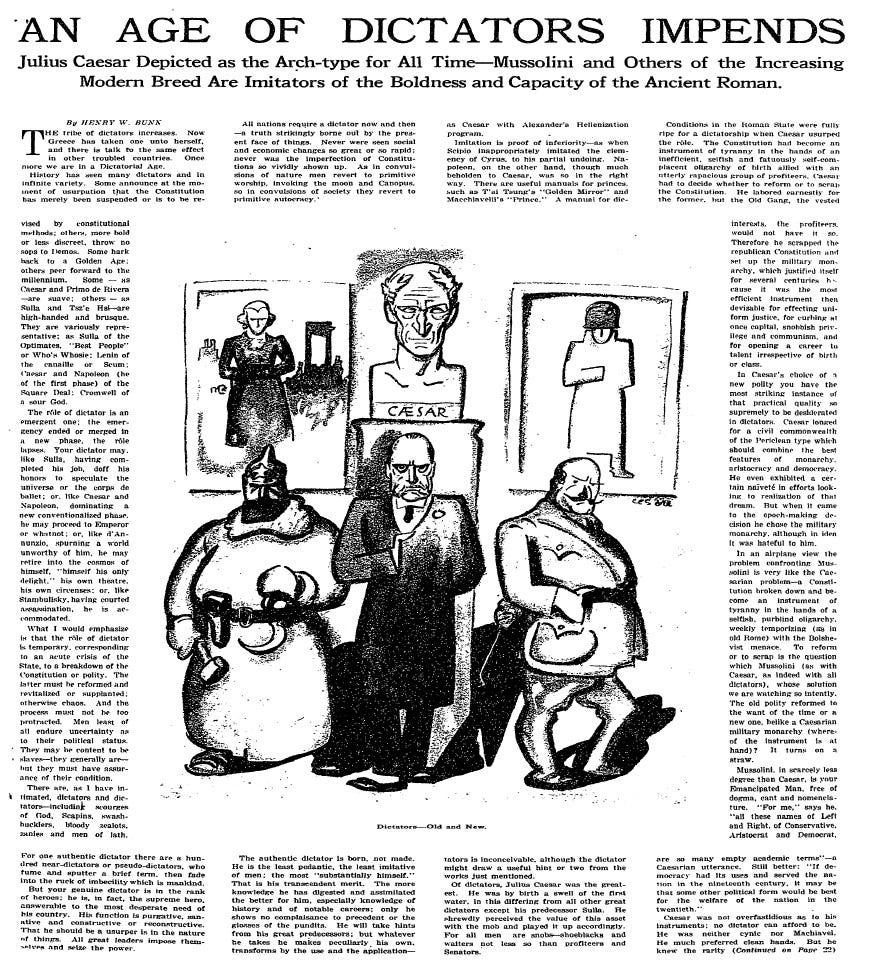 Bunn’s 1926 journalism article itself was actually mostly a history article, about Julius Caesar and how he set the prototype for more modern dictators. But in an interesting paragraph, Bunn also wrote that dictators were sometimes necessary, in his view: