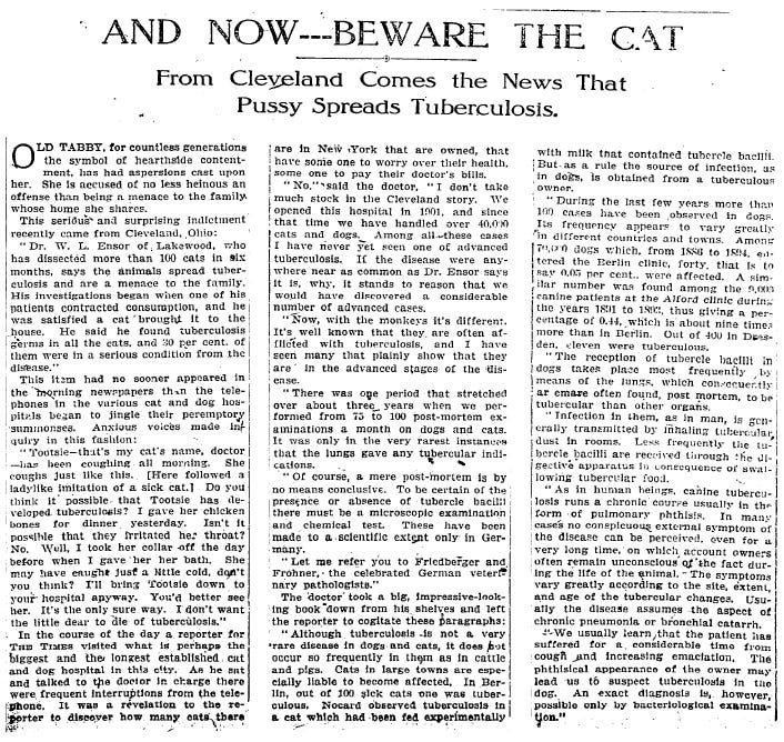 And Now — Beware The CatDavid FriedmanJan 07, 2011ShareGet your mind out of the gutter.AND NOW -- BEWARE THE CAT: From Cleveland Comes the News That Pussy Spreads Tuberculosis. (PDF)From January 8, 1911