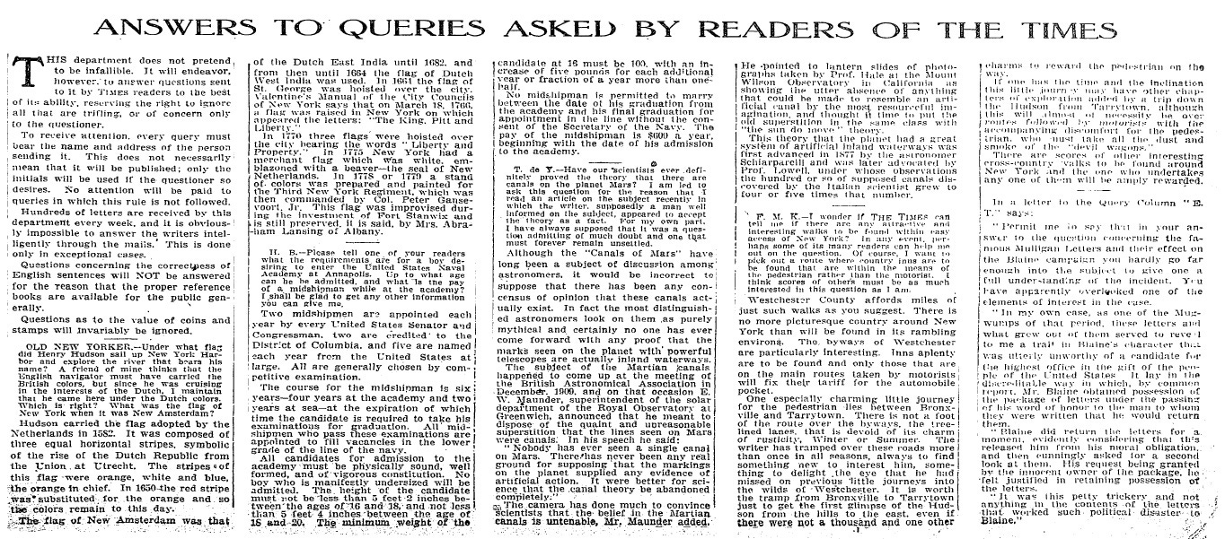This article is one early example of a column that ran at least as far back as 1908, often under the name "Queries From The Curious And Answers To Them."