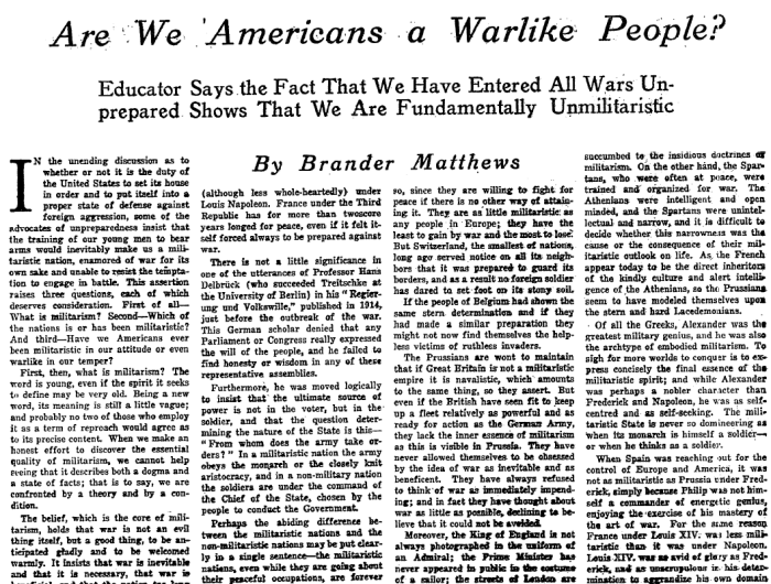 Brander Matthews, Columbia University's Chair of Dramatic Literature, tackled the question of whether Americans were inherently militaristic in this essay written shortly after the country's entry into World War I. Matthews' conclusion was that although we possessed some aspects of that trait, for the most part we weren't militaristic. However, some of his reasoning arguably doesn't hold up as well a century later.