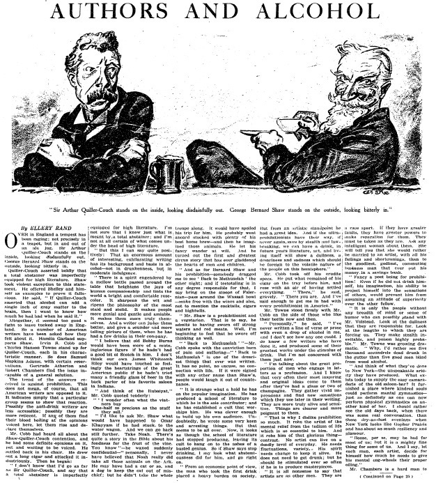 Novels often take 2-3 years to write their works. So during the third year of Prohibition in 1922, the New York Times Magazine asked: do writers need alcohol for greatness, and was Prohibition starting to affect the quality of American literature?
