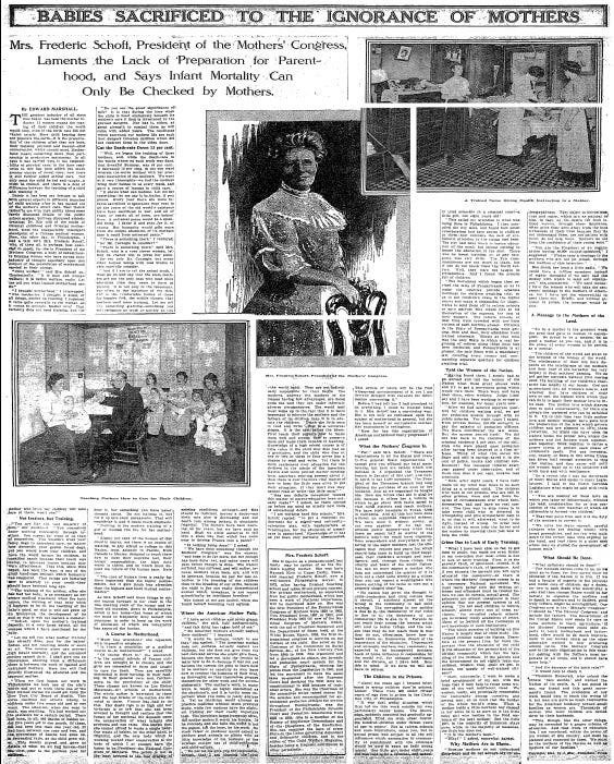 Is good parenting a natural instinct, or something that is learned? It's probably a bit of both, and in 1911 the Mothers Congress sought to train mothers in good parenting practices. They wanted to cut rates of infant mortality, and reduce the number of kids who grow up to be criminals.