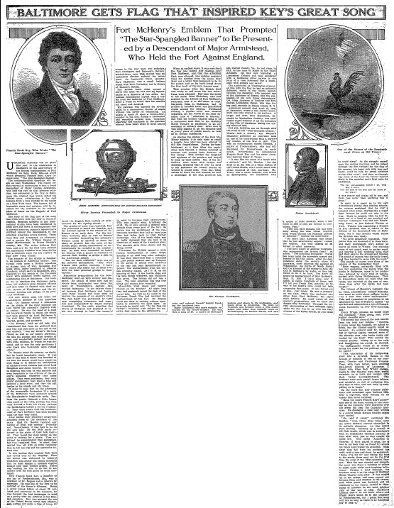 BALTIMORE GETS FLAG THAT INSPIRED KEY'S GREAT SONG: Fort McHenry's Emblem That Prompted "The Star-Spangled Banner" to Be Presented by a Descendant of Major Armistead, Who Held the Fort Against England. (PDF)