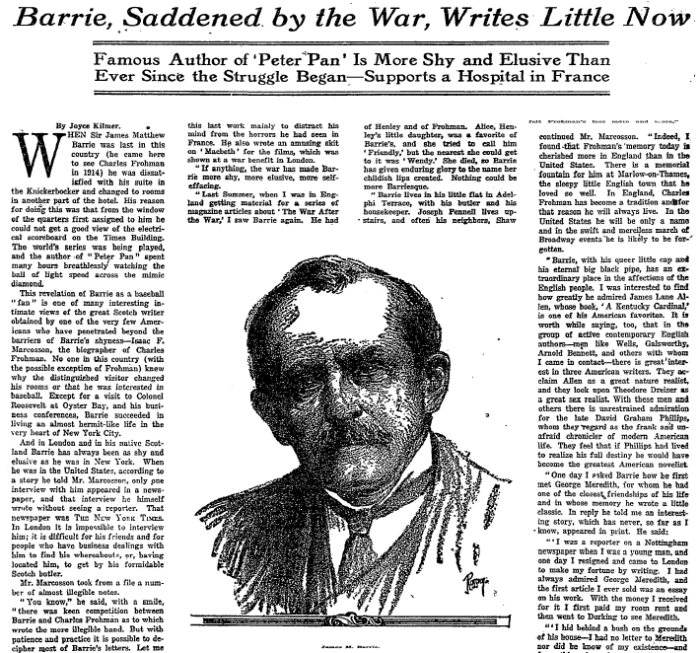 Barrie, Saddened by the War, Writes Little Now: Famous Author of 'Peter Pan' Is More Shy and Elusive Than Ever Since the Struggle Began -- Supports a Hospital in France