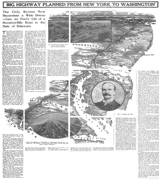 BIG HIGHWAY PLANNED FROM NEW YORK TO WASHINGTON: The Only Routes Now Necessitate a Wide Detour -- Gen. du Pont's Gift of a Hundred-Mile Road to the State of Delaware (PDF)