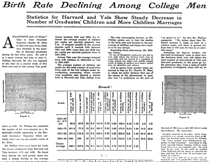 Birth Rate Declining Among College Men: Statistics for Harvard and Yale Show Steady Decrease in Number of Graduates' Children and More Childless Marriages