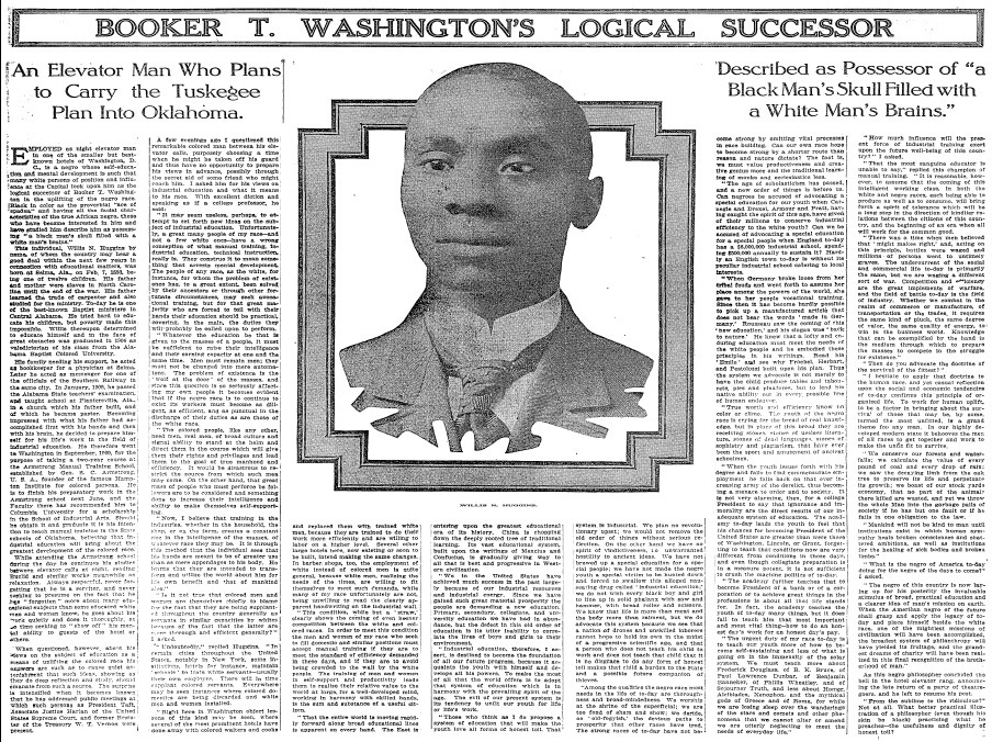 BOOKER T. WASHINGTON'S LOGICAL SUCCESSOR: An Elevator Man Who Plans to Carry the Tuskegee Plan Into Oklahoma. Described as Possessor of "a Black Man's Skull Filled with a White Man's Brains." (PDF)