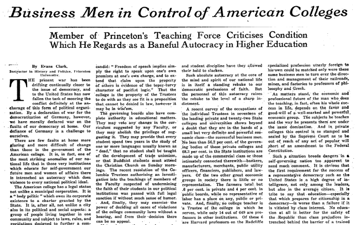 Evans Clark, a professor of history and politics and Princeton, lamented the increased influence of members of the business community on American universities in 1917. Clark perceived these board of trustees or regents as often lacking either familiarity or best interests of the school they represented: