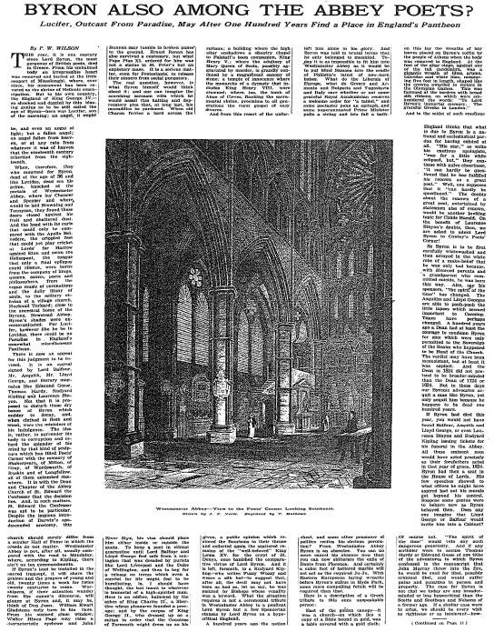 On the 100th anniversary of British poet Lord Byron's death in 1924, New York Times Magazine asked why Byron wasn't commemorated in Poets' Corner of London's Westminster Abbey. A memorial would later be erected there in 1969.
