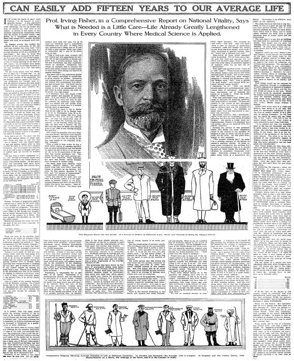 Fisher was a proponent of eugenics -- the notion that we can improve our species through selective breeding, including sterilization of the mentally impaired -- which was a much more popular movement before the Nazis used it as an excuse for mass slaughter. (Other eugenics proponents included John Harvey Kellogg, inventor of corn flakes.) Fisher wrote a book called How to Live: Rules for Healthful Living Based on Modern Science which became a bestseller, and can be read for free here.