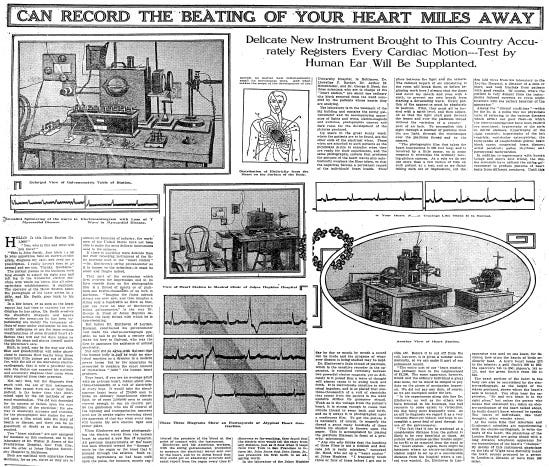 The article imagines a future where everyone has a terminal in their workplace connected remotely to "heart stations" where the main EKG lives: