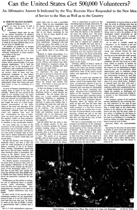 Secretary of War Newton D. Baker argued yes: "He has stated not only that such an army [of 500,000 men] could be raised by voluntary enlistment in peace time, but that to raise it would be no more difficult than to enlist an army of 100,000 men."