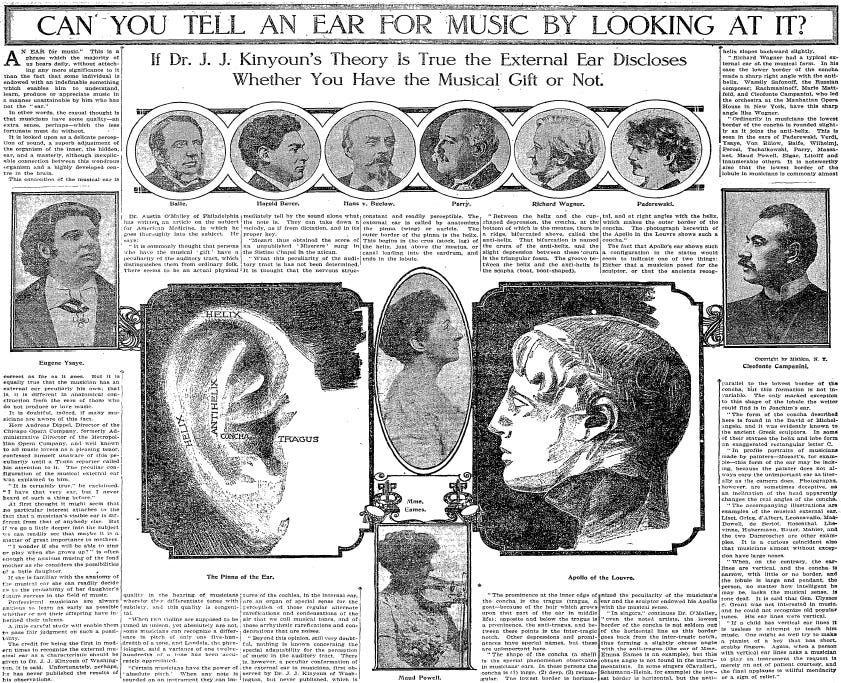 If the hoaxter had seen this 1910 article, perhaps his fictional doctor could have marketed his craft differently. This article claims that ear shape determined not your ability to appreciate music, but to be musical yourself. As one doctor quoted in the article says: