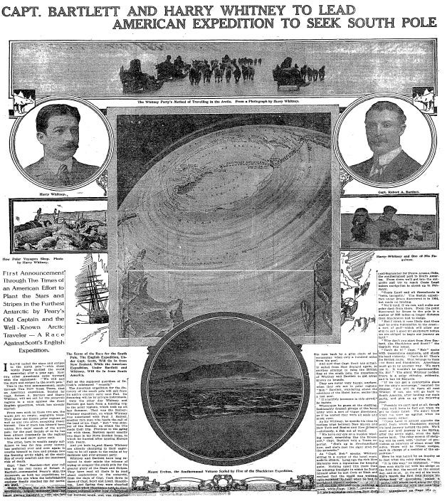 Back to the point of the article: Captain Bartlett and Harry Whitney set out to be the first people to reach the South Pole. Spoiler alert! They didn't make it. The first people to reach the pole were a Norwegian party in December 1911.