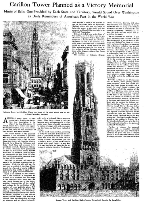 Carillon Tower Planned as a Victory Memorial: Music of Bells, One Provided by Each State and Territory, Would Sound Over Washington as Daily Reminders of America's Part in the World War