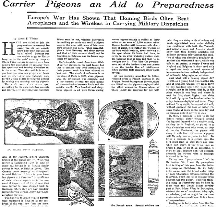 As the sub-headline suggests, 1916 was an era where a bird could be counted on as more reliable and speedier than "aeroplanes" or "the wireless." Today, of course, with supersonic jets and instant communication worldwide via the Internet and other digital devices, that is no longer true. The U.S. military stopped using messenger pigeons in 1957. Yet the NYT article estimates that 18,000 such pigeons were being used in France alone during 1916.
