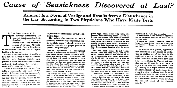 Physicians Dr. Lewis Fisher and Dr. Isaac H. Jones published an article "Vertigo and Seasickness, Their Relation to the Ear" in the New York Medical Journal in 1916, claiming that the condition was related to "a disturbance in the ear." That is why "Persons in whom the mechanism has been destroyed -- deaf-mutes, for instance -- never suffer from mal de mer."