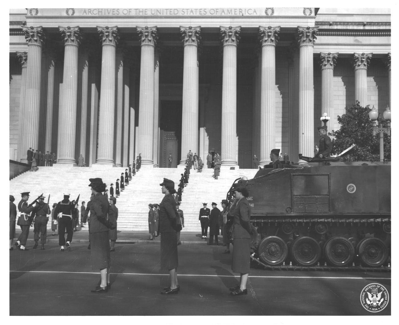 So in 1952, custody of the Declaration was transferred to the National Archives, where it has remained on public display ever since. The transfer ceremony looked quite elaborate:
