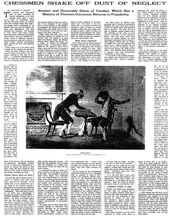 The ancient and honorable game of chess, according to current indications, is on the upgrade again after a temporary lapse in popularity. Not long ago the chess rooms in various cities were scantily filled, their playing boards lonely monuments to a pastime that was once the delight of kings and philosophers. But the situation has changed. The boards in New York’s half dozen chess clubs find eager combatants gathered around them; there are contests between teams of different leagues; the king and the rook have even invaded certain colorful restaurants where patrons pit their wits against each other.
