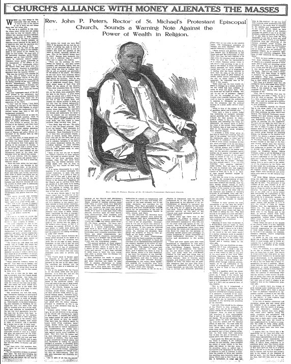 CHURCH'S ALLIANCE WITH MONEY ALIENATES THE MASSES: Rev. John P. Peters, Rector of St. Michael's Protestant Episcopal Church, Sounds a Warning Note Against the Power of Wealth in Religion. (PDF)