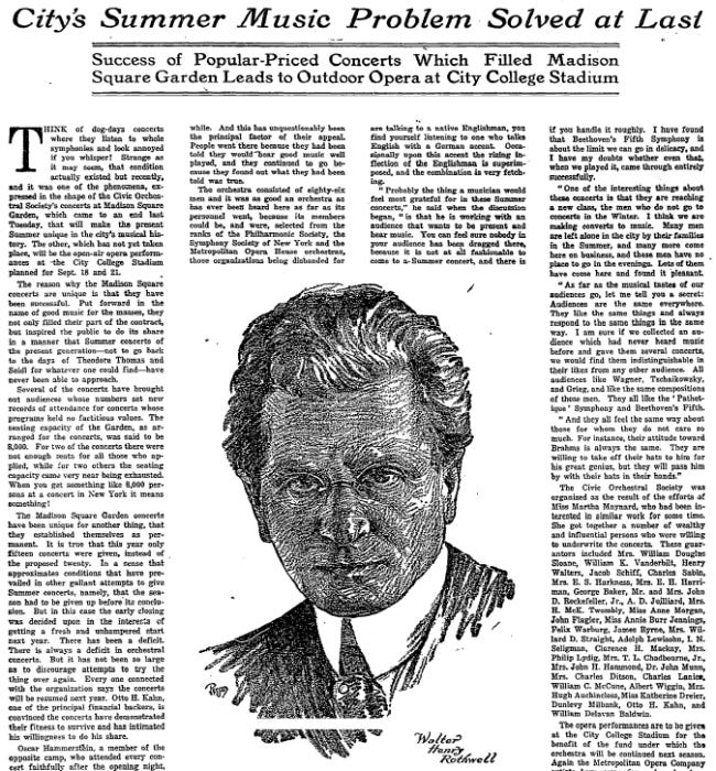 An article about the then-recent attempts in 1916 to have low-priced opera and orchestral concerts for the New York City public. This sentence in particular illustrates just how long ago this was: "When you get something like 8,000 persons at a concert in New York it means something!" Later today as of this writing, Bruce Springsteen is playing MetLife Stadium which has a seating capacity of 82,000.