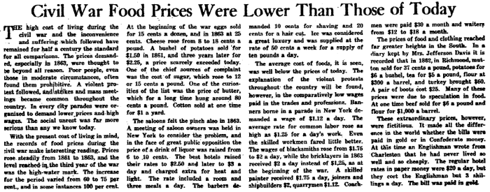Between 1861 and 1863, the Civil War caused huge percentage price jumps. Eggs went from 15 to 25 cents per dozen, cheese from 8 to 18 cents per pound, and a bushel of potatoes from $1.50 to $2.25.