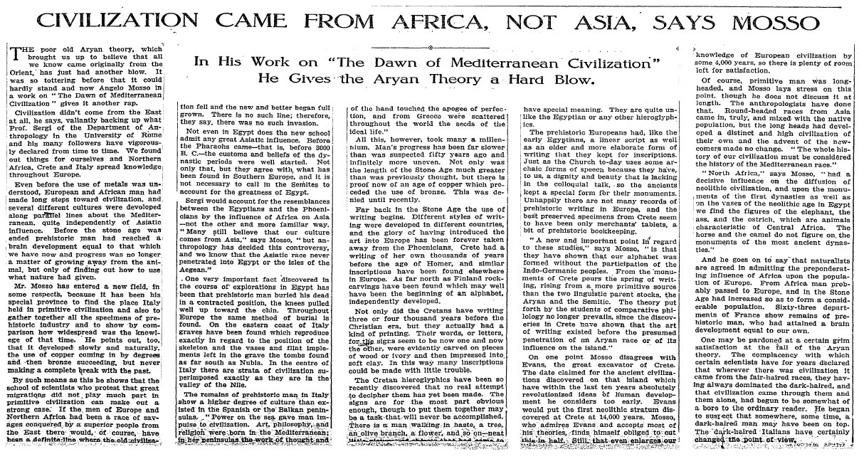 CIVILIZATION CAME FROM AFRICA, NOT ASIA, SAYS MOSSO: In His Work on "The Dawn of Mediterranean Civilization" He Gives the Aryan Theory a Hard Blow. (PDF)