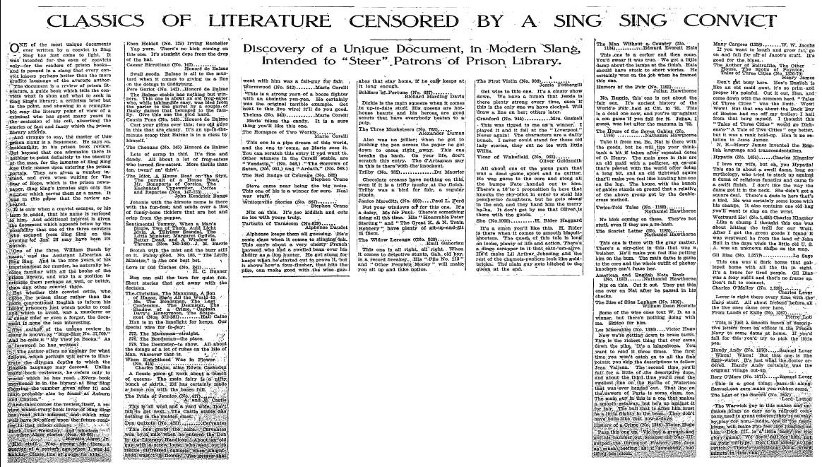 CLASSICS OF LITERATURE CENSORED BY A SING SING CONVICT: Discovery of a Unique Document, in Modern Slang, Intended to "Steer" Patrons of Prison Library. (PDF)