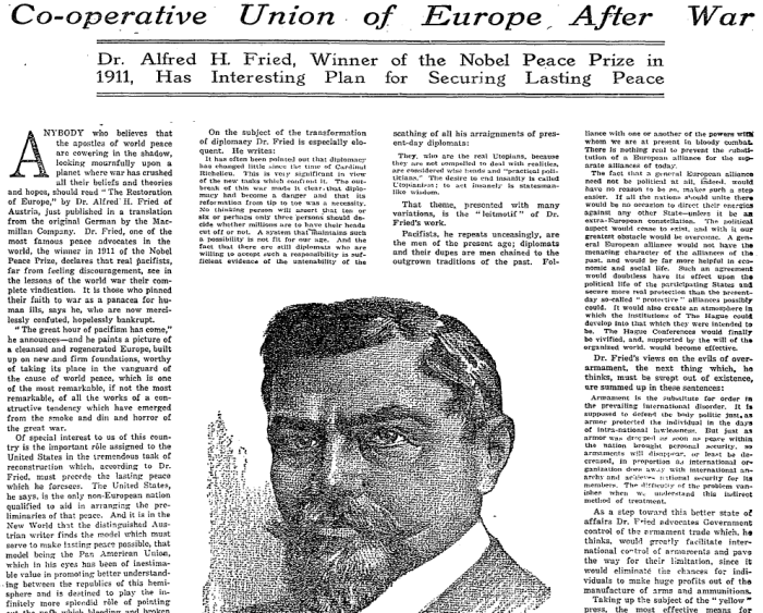 Alfred Fried was an Austrian thinker and writer who advocated more globalism over nationalism, helping create the idea which eventually became the League of Nations in 1919 and serving as one of the primary advocates for Esperanto, the attempt at creating a worldwide universal language (a largely-failed idea that nonetheless still retains millions of advocates to this day). In this article Fried suggests something of a European-wide supra-national government akin to what the EU eventually became several decades later. Some of his arguments remain similar to what the "Remain" camp advocated in the Brexit debate: