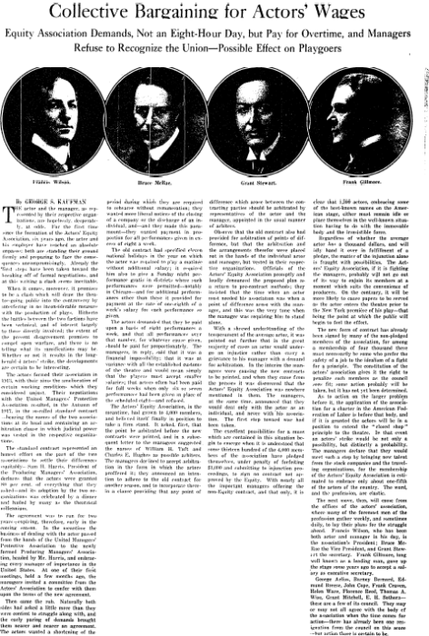 Collective Bargaining for Actors' Wages: Equity Association Demands, Not an Eight-Hour Day, but Pay for Overtime, and Managers Refuse to Recognize the Union -- Possible Effect on Playgoers
