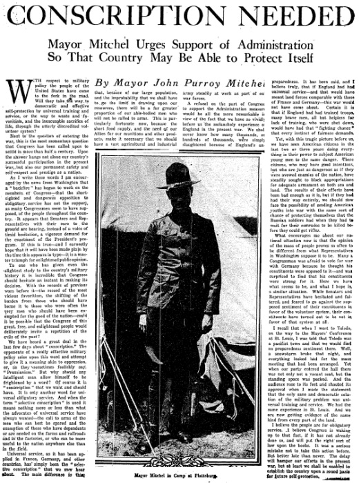 On April 22 of that year, though, a draft was not certain. The first branch of Congress to pass the legislation would not occur for another few days, until April 28. New York City Mayor John Purroy Mitchel wrote this opinion column advocating for the measure: