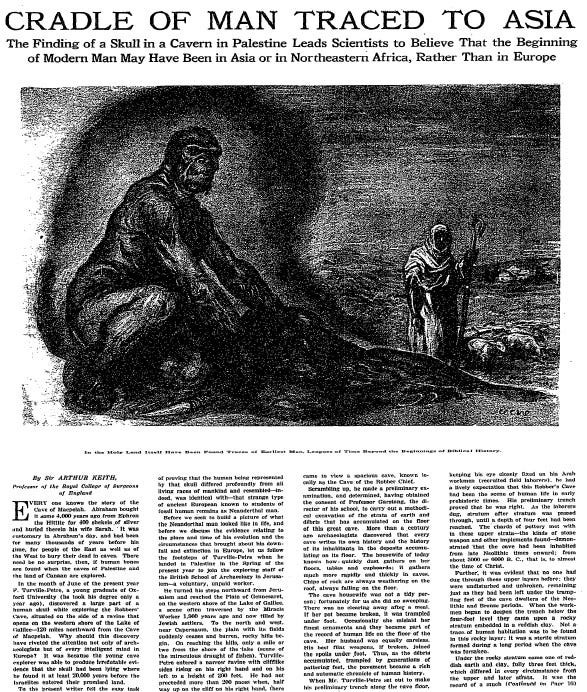 Humans may have originated in “Asia” (the Middle East) “or northeastern Africa,” according to a 1925 New York Times Magazine article, instead of Europe as previously thought.