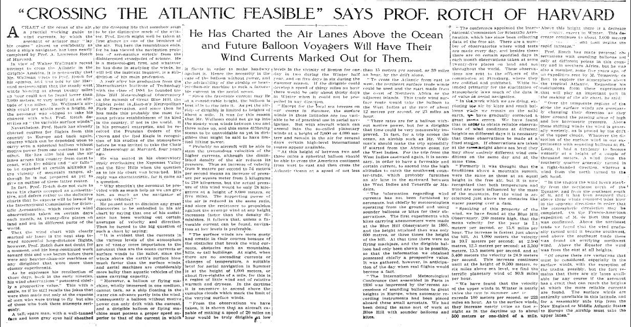 "CROSSING THE ATLANTIC FEASIBLE" SAYS PROF. ROTCH OF HARVARD: He Has Charted the Air Lanes Above the Ocean and Future Balloon Voyagers Will Have Their Wind Currents Marked Out For Them. (PDF)