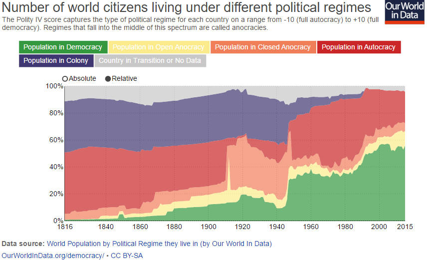 The fear that democracy was doomed turned out to be short-lived. According to Our World In Data, back in 1917, 14 percent of the world's population lived in democracy. By 2015, that had increased substantially to 56 percent. Meanwhile, 0 percent lived in a colony, compared to 36 percent back in 1917.