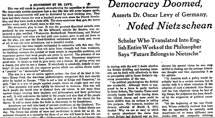Democracy Doomed, Asserts Dr. Oscar Levy of Germany, Noted Nietzschean
